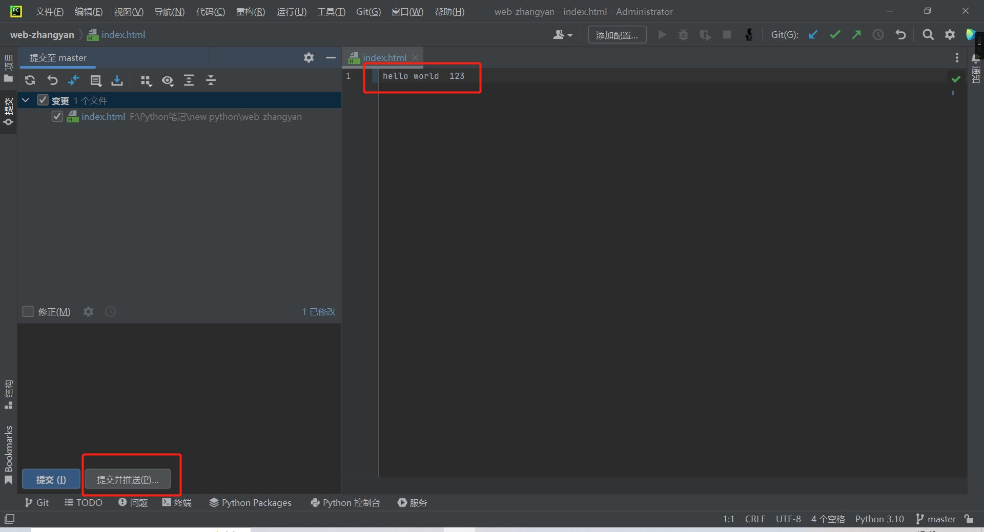 模拟修改代码,提交代码 (这里只会识别修改过的来提交)